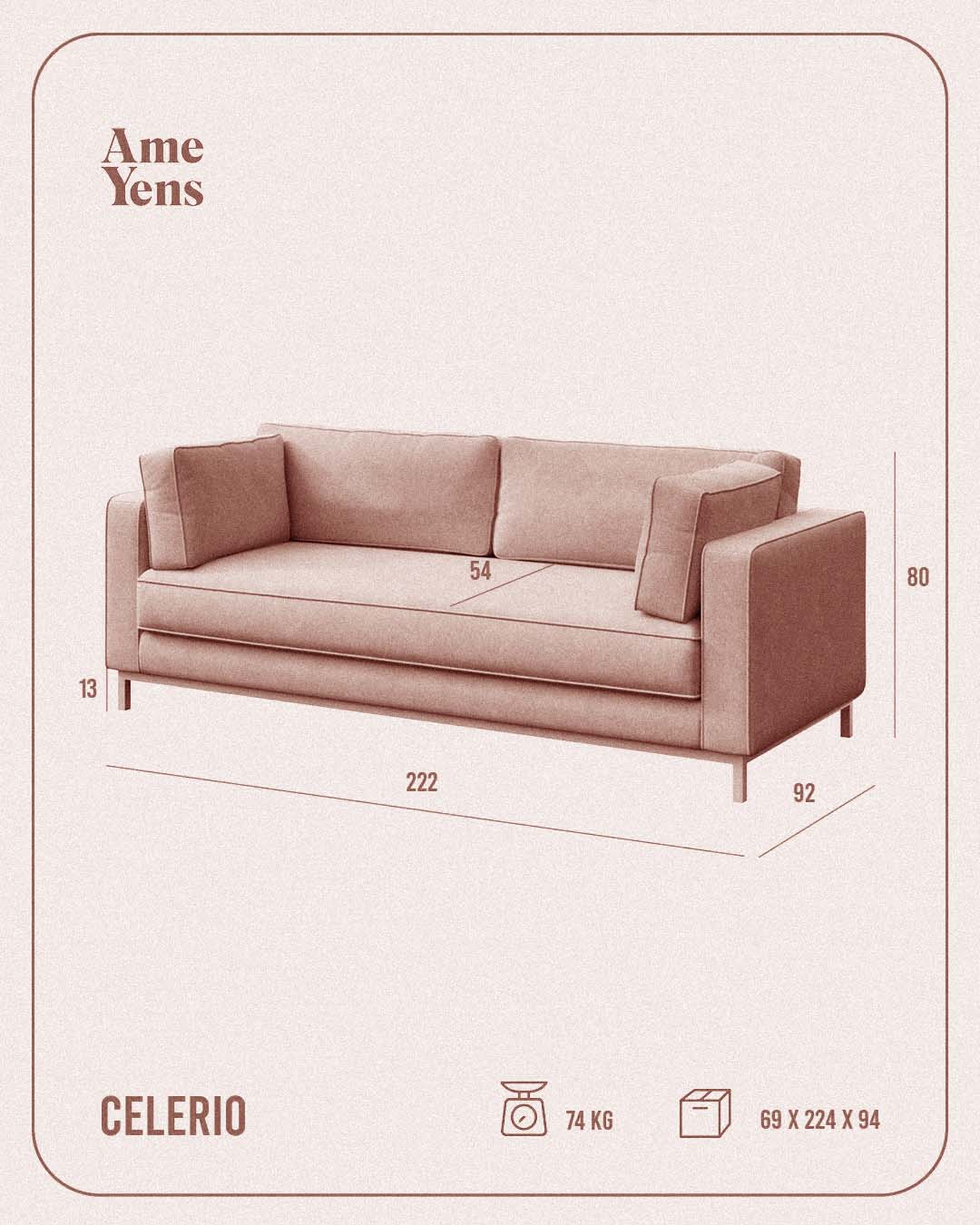 CELERIO est une collection caractérisée par un design élégant, minimaliste et symétrique. Les coussins du canapé, aux dimensions régulières, soulignent la symétrie et le raffinement de sa conception. Le dossier est divisé en deux parties. L'épaisseur des coussins reprend les dimensions de l'assise. L'ensemble repose sur une fine structure en bois clair naturel, dotée de pieds droits de la même épaisseur. Des coussins supplémentaires sont disposés de part et d'autre du canapé. Le canapé trois places CELERIO incarne à merveille l'esprit de la collection. Ce meuble s'intègre parfaitement aussi bien dans un intérieur rustique que dans un loft minimaliste.