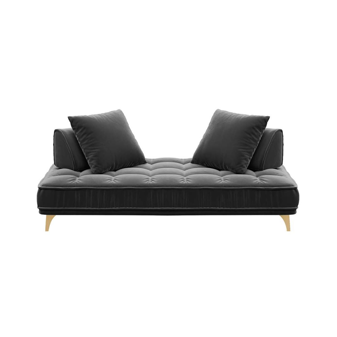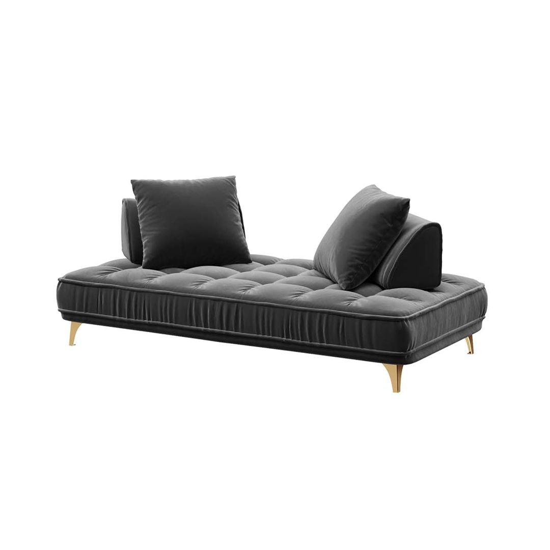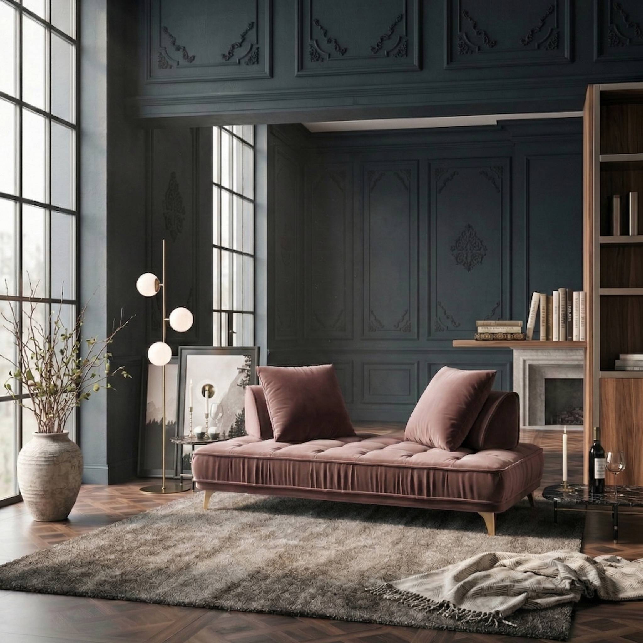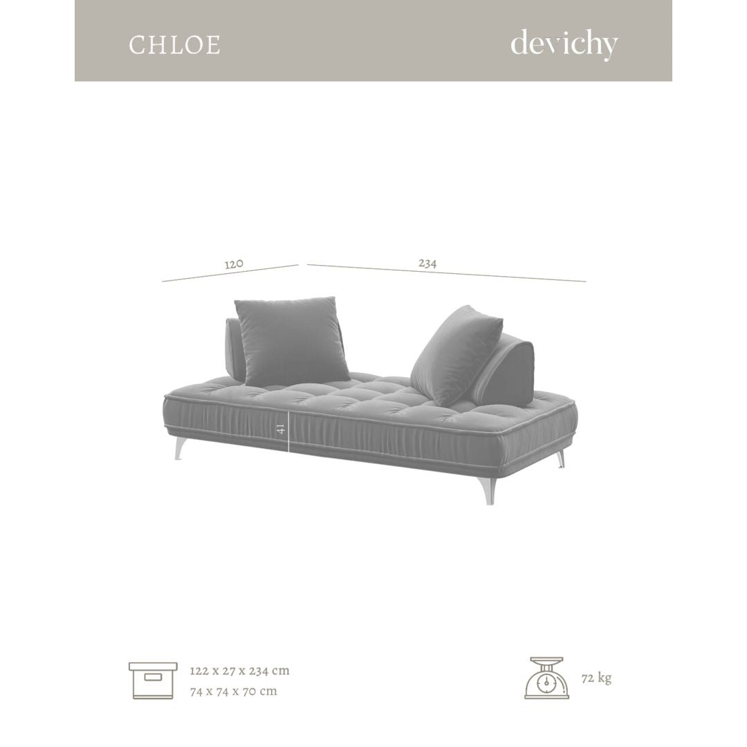 La méridienne Chloe a une forme unique, soulignée par une bordure exclusive et une assise entièrement capitonnée. Elle crée du caractère et réchauffe l'intérieur. Chloe est un meuble plein de luxe dans chaque détail, dont la légèreté est apportée par des pieds en acier contournés dorés. Elle remplit parfaitement la fonction de canapé et de lit de jour confortable.