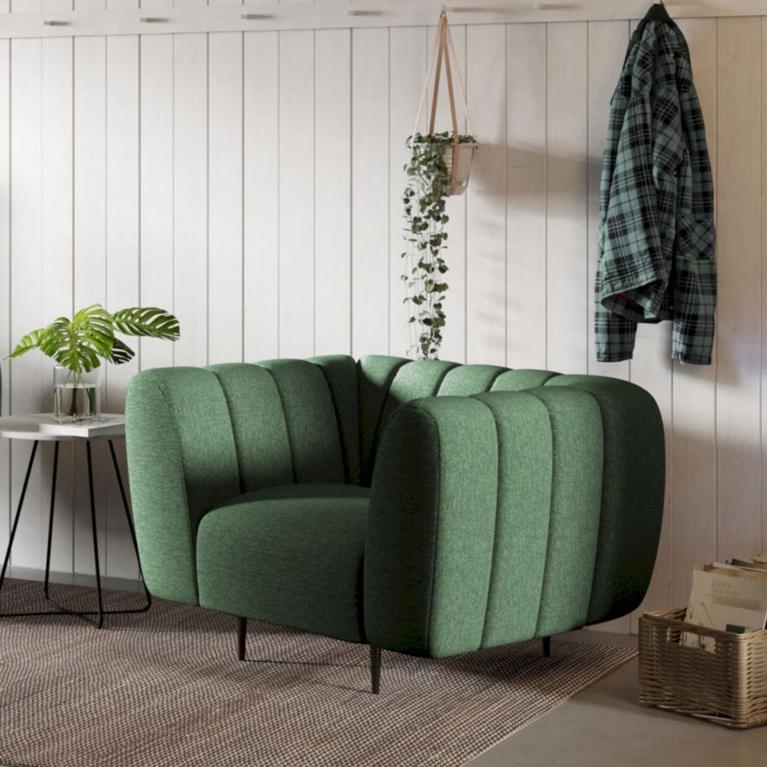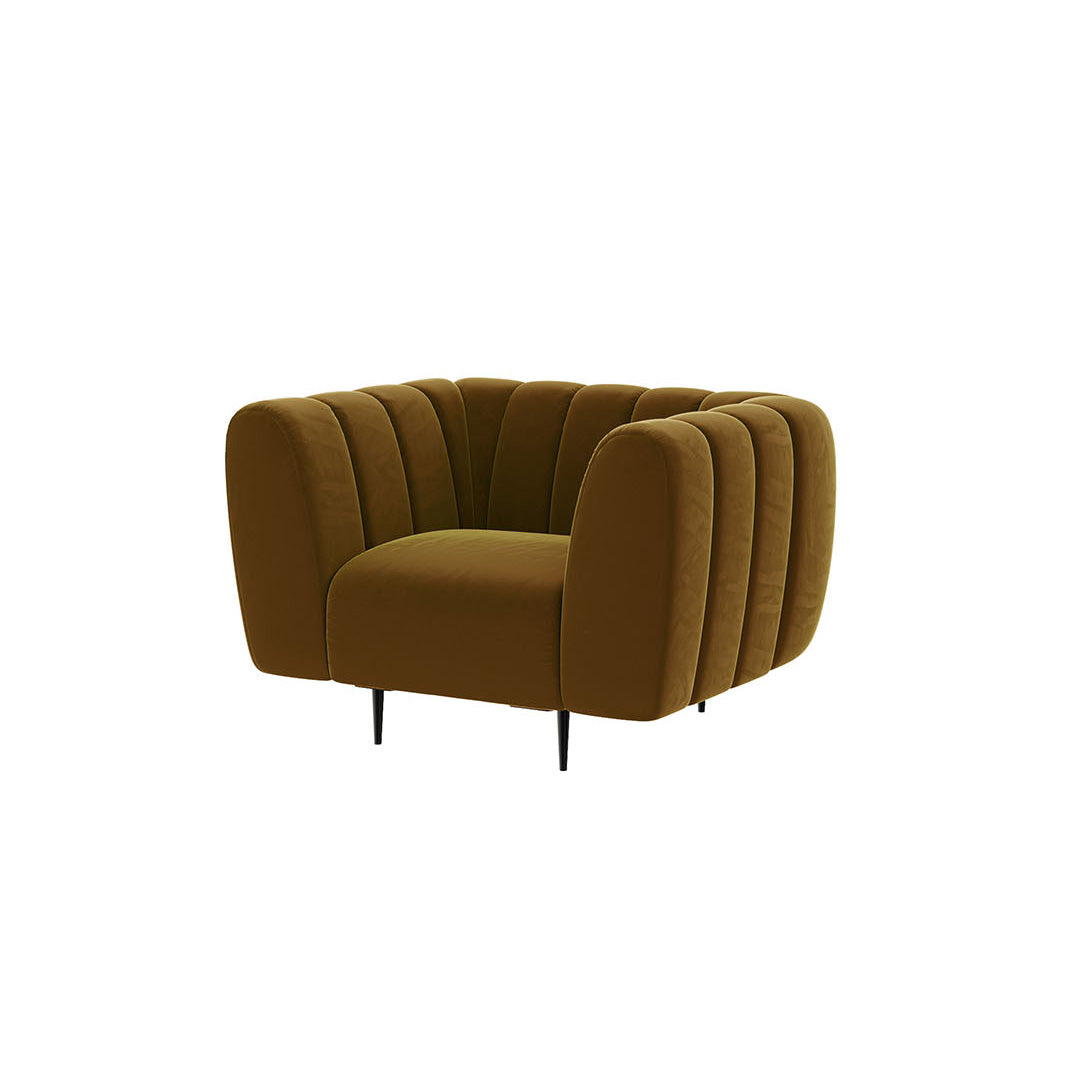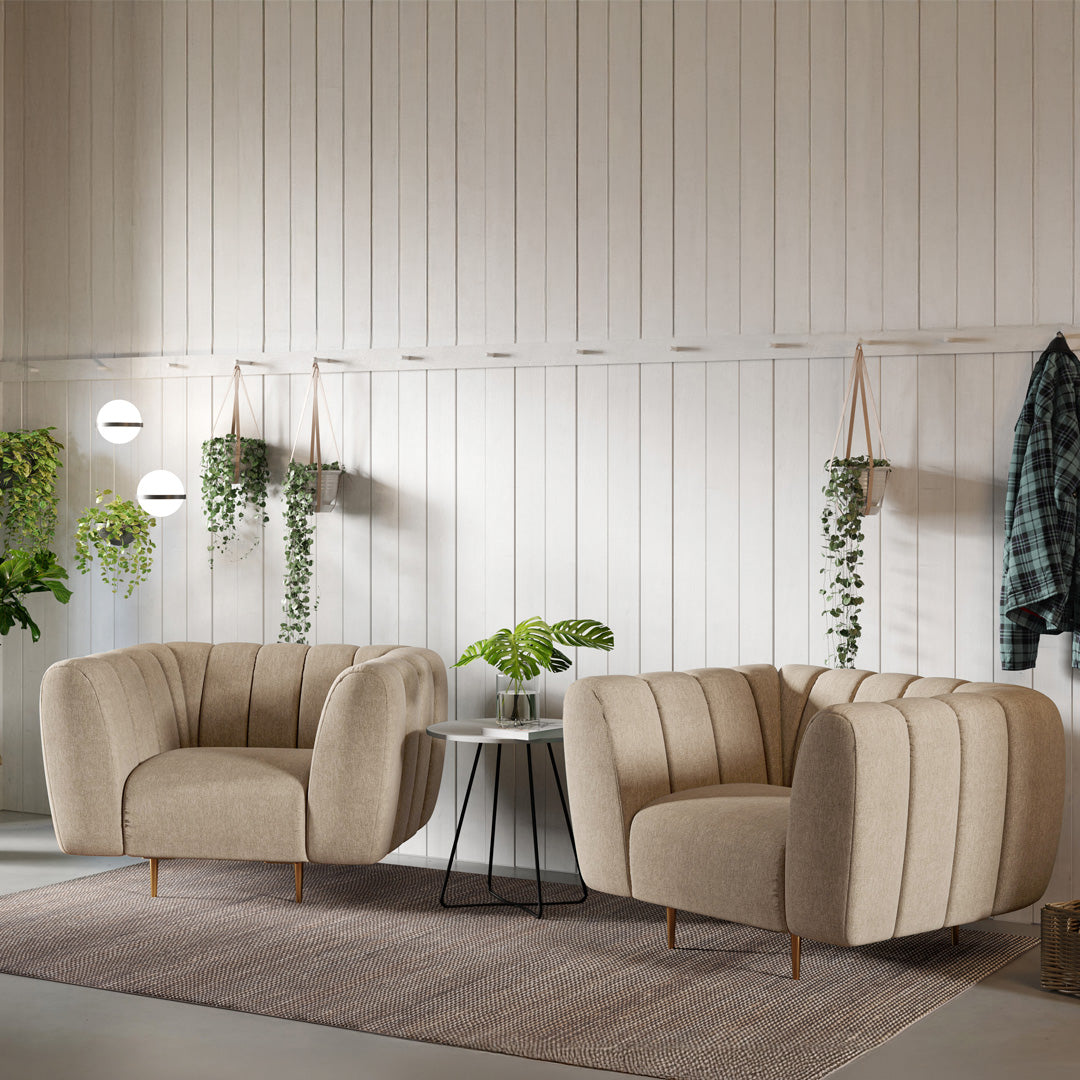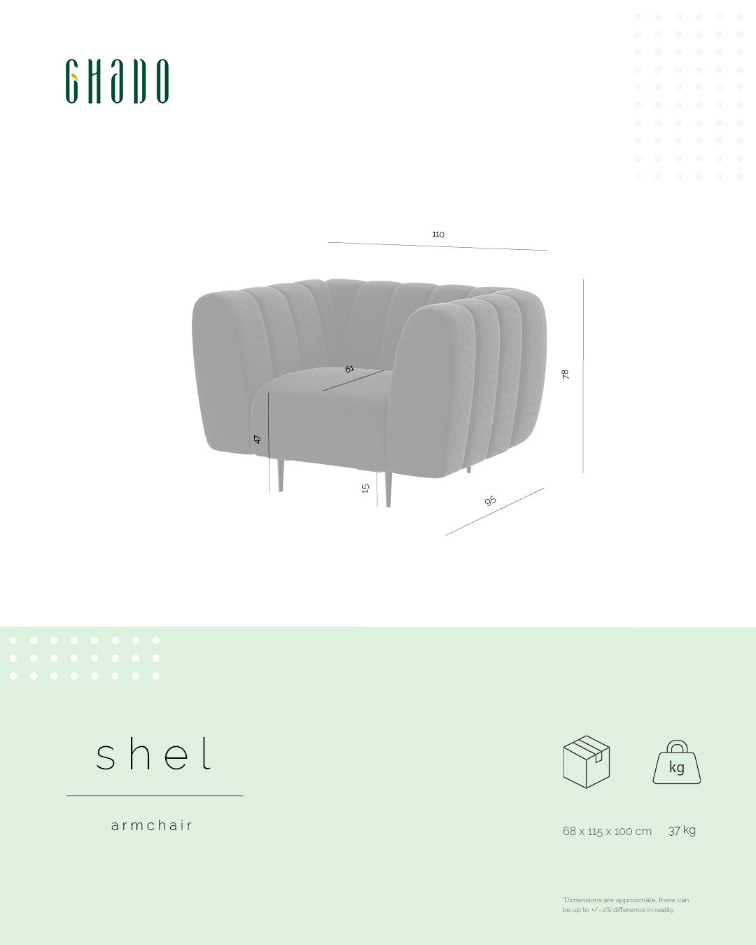 Shel is a fancy sofa that stands out thanks to the vertical tufting in the back and armrests while thin metal legs contrast with a comfy massive seat. Ghado fabric selection goes well with simple scandi interiors but at the same time, glamour velvets make it a perfect sofa for elegant designs.