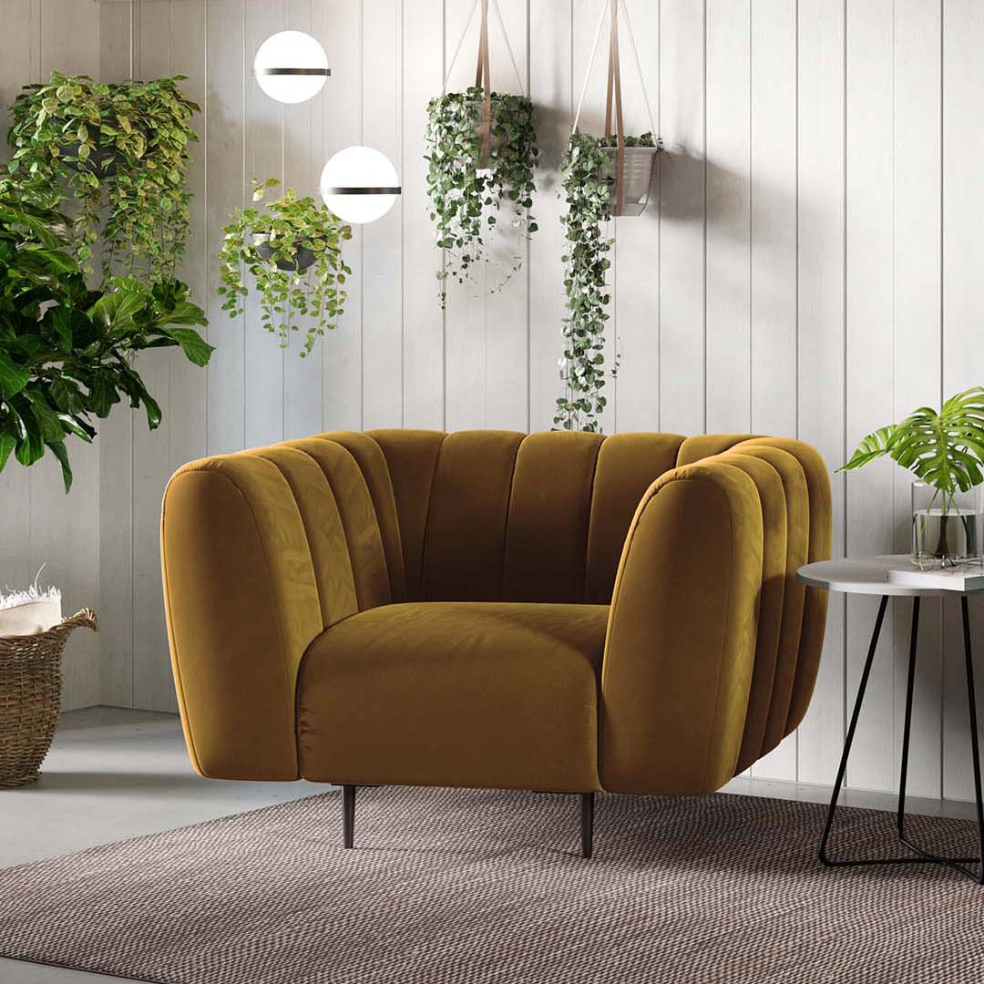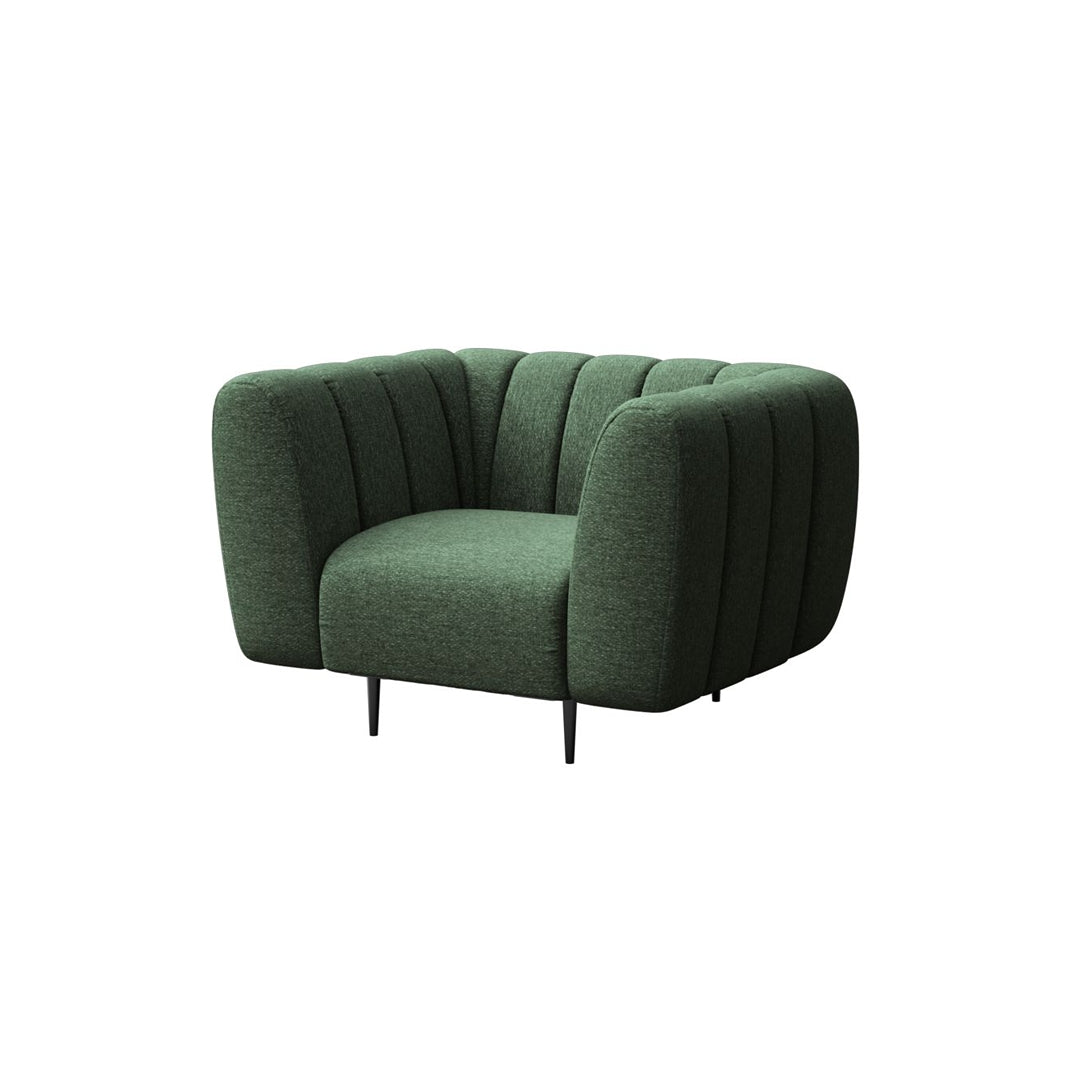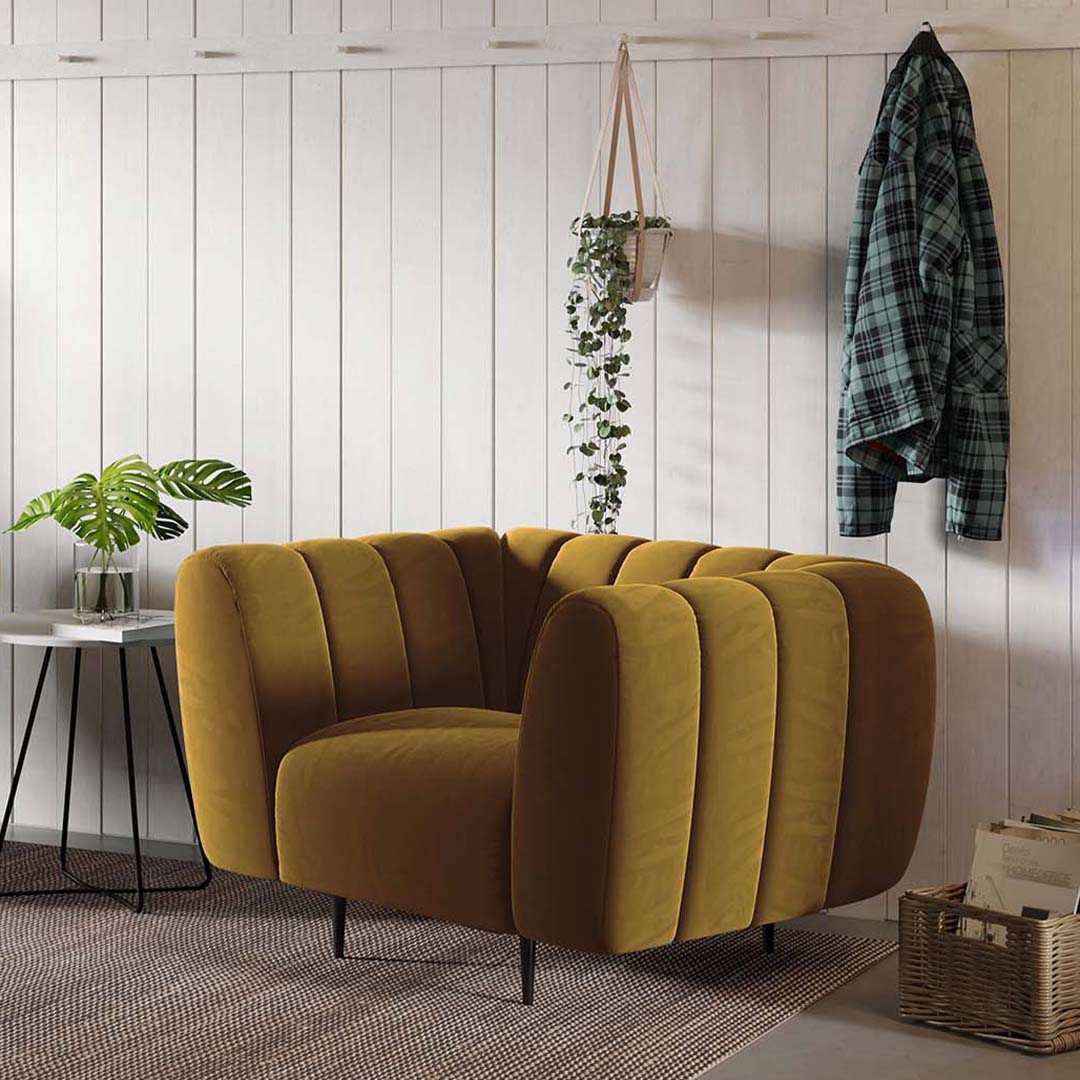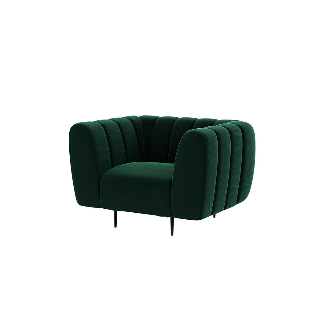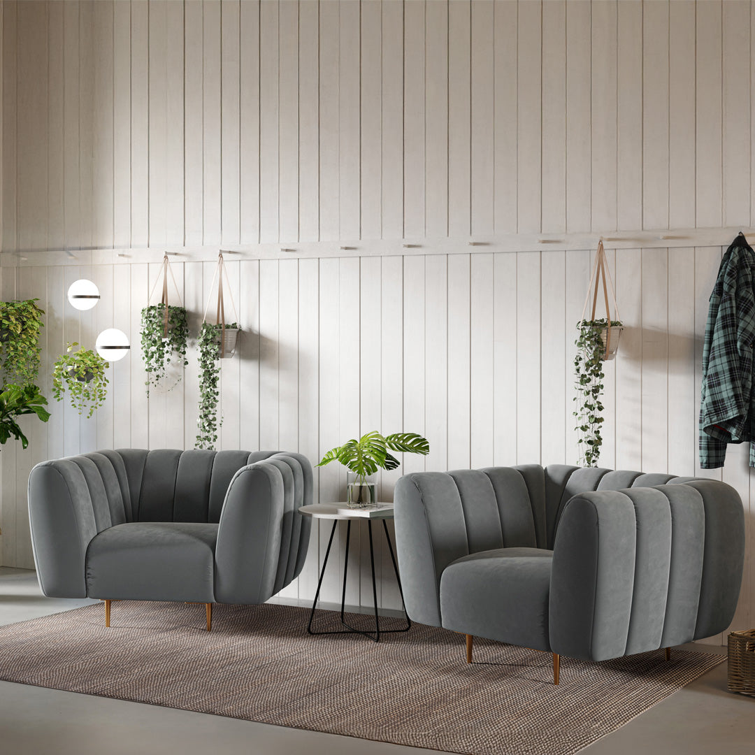Shel is a fancy sofa that stands out thanks to the vertical tufting in the back and armrests while thin metal legs contrast with a comfy massive seat. Ghado fabric selection goes well with simple scandi interiors but at the same time, glamour velvets make it a perfect sofa for elegant designs.