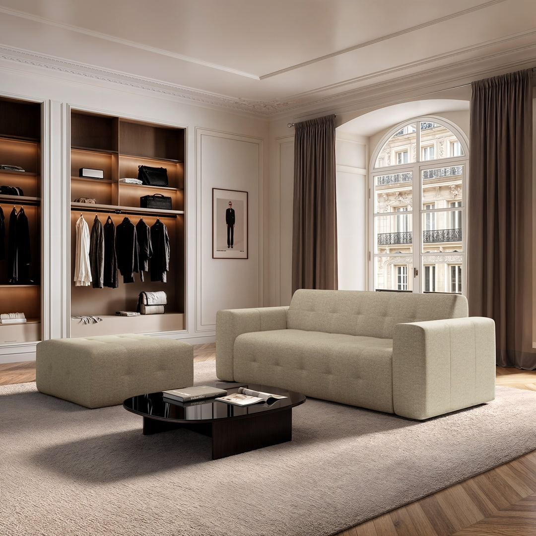 Introducing Tuil collection, where Rodier timeless elegance meets cozy sophistication. With its low legs and massive armrests, Tuil exudes a bold, bulky form that adds presence to any room while remaining elegantly simple. Thoughtfully crafted, it’s spacious and inviting, with delicate tuffings details that lend a unique touch of refinement. Choose your upholstery in soft velvet-touch fabrics or a chic weave. Designed to comfortably accommodate many, Tuil collection is the ultimate choice for those seeking both trend and comfort in this Rodier statement piece.