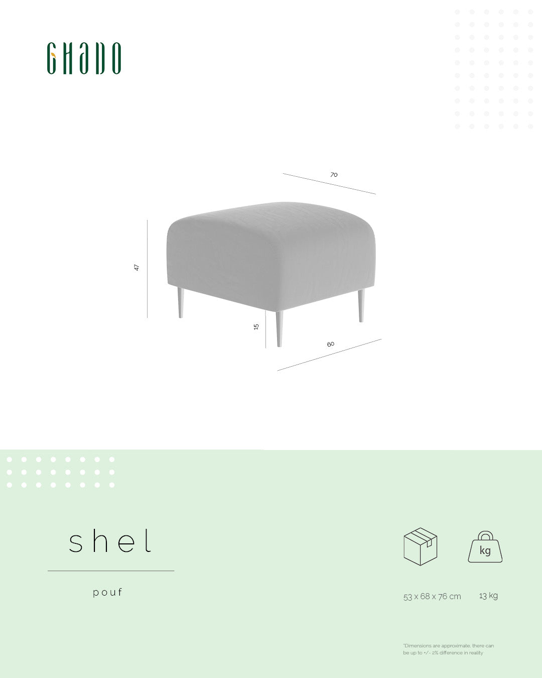 Shel pouffe is one of the products from the collection of the same title. Together with the sofa, the pouffe makes a perfect set for a modern living room. Incredibly soft filling of the furniture allows you to relax while sitting or freely leave your feet on it. Shel pouffe with its styling refers to the entire collection. Slender metal legs of the furniture add lightness to the piece and make the pouffe a tasteful addition to the interior.